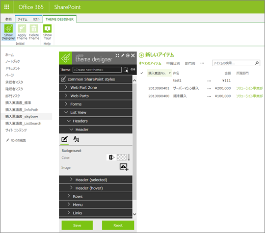 SharePoint の画面上に Theme Designer と呼ぶ GUI メニューが表示されますので、目的に応じて変更したい要素を選択し、色やフォントなどを変えて行きます。GUI メニューはブラウザにあるような開発者ツールと同じ操作感です。