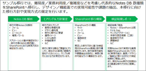 このキャンペーンは、Notes から Office 365 ( SharePoint Online 、 PowerApps )へ移行をご検討中のお客様向けに短期間/低コストで実現可能性や、サンプルアプリケーション作成、移行検証をセットとした包括的な Notes 移行/PowerApps 導入検証サービスとなります。